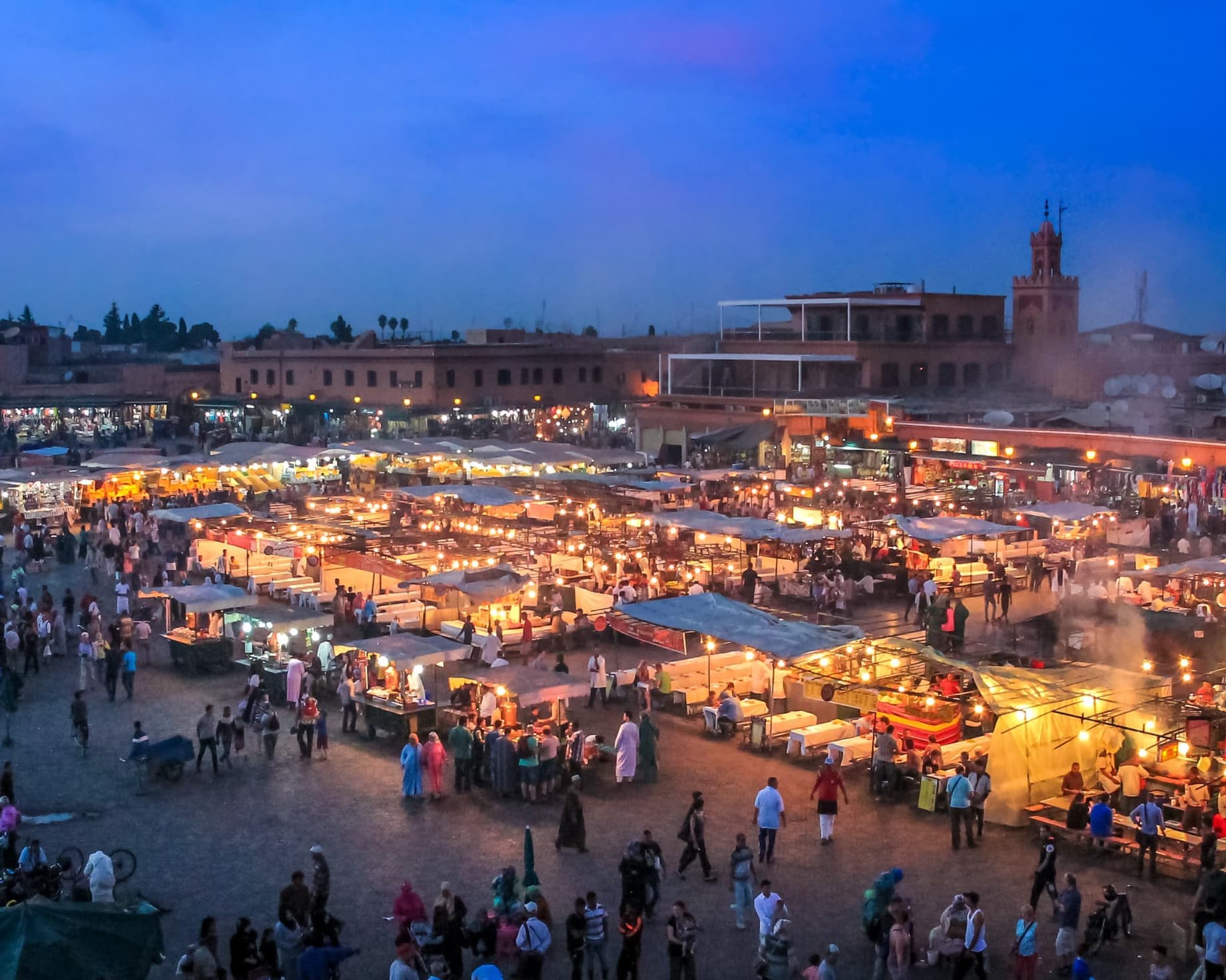 En la plaza Djamaa el Fna, la vida estalla en colores y sonidos: narradores, músicos y el perfume del azafrán te envuelven en su embrujo.